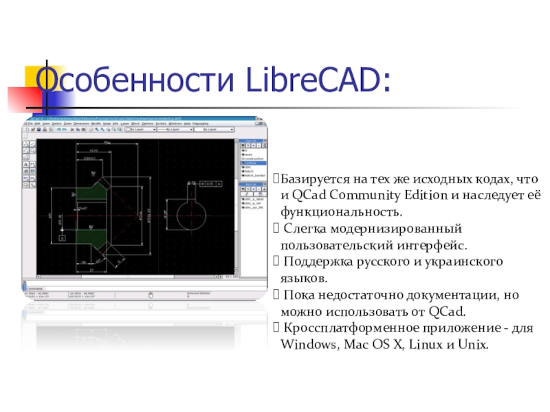 Слайд 10Особенности LibreCAD: