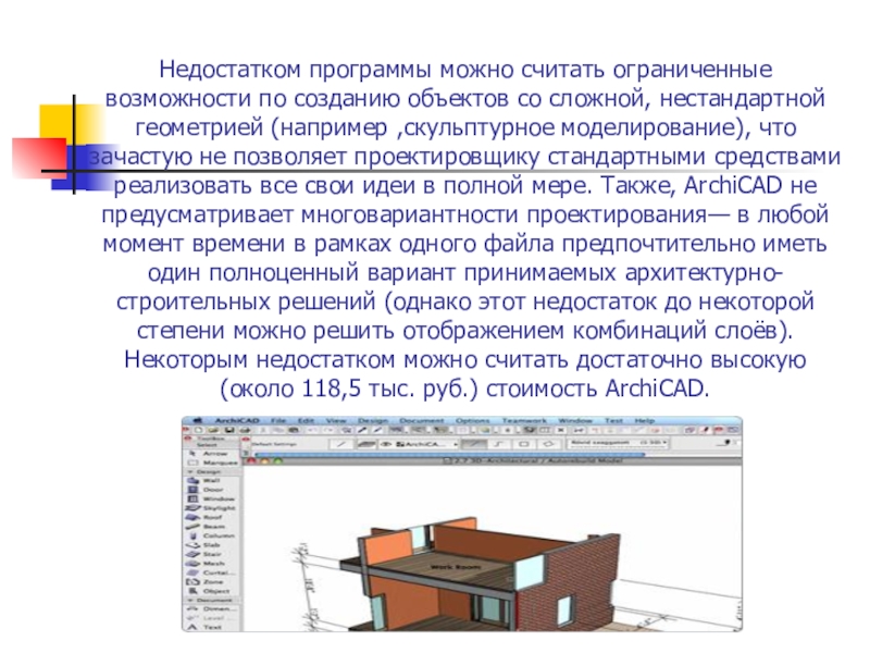нестандартной геометрией (например ,скульптурное моделирование), что зачастую не позволяет проектировщику стандартными средствами реализовать все свои идеи в полной мере. Также, ArchiCAD не предусматривает многовариантности проектирования— в любой момент времени в рамках одного файла предпочтительно иметь один полноценный вариант принимаемых архитектурно-строительных решений (однако этот недостаток до некоторой степени можно решить отображением комбинаций слоёв).