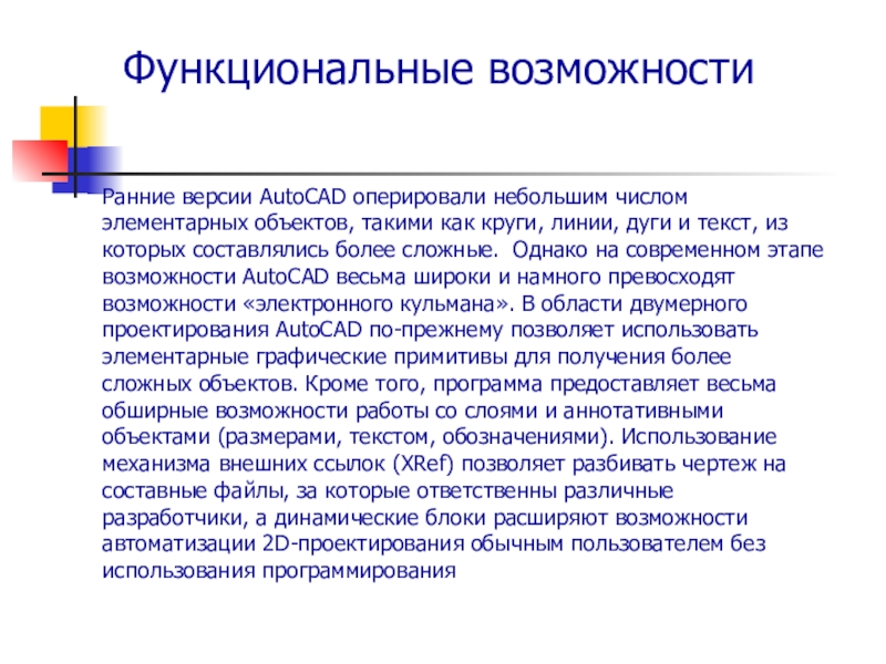 круги, линии, дуги и текст, из которых составлялись более сложные. Однако на современном этапе возможности AutoCAD весьма широки и намного превосходят возможности «электронного кульмана». В области двумерного проектирования AutoCAD по-прежнему позволяет использовать элементарные графические примитивы для получения более сложных объектов. Кроме того, программа предоставляет весьма обширные возможности работы со слоями и аннотативными объектами (размерами, текстом, обозначениями). Использование механизма внешних ссылок (XRef) позволяет разбивать чертеж на составные файлы, за которые ответственны различные разработчики, а динамические блоки расширяют возможности автоматизации 2D-проектирования обычным пользователем без использования программирования