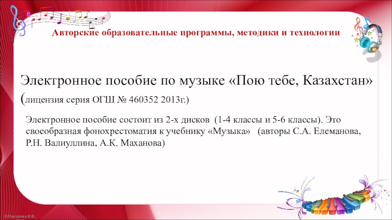 Электронное пособие состоит из 2-х дисков (1-4 классы и 5-6 классы). Это своеобразная фонохрестоматия к учебнику «Музыка» (авторы С.А. Елеманова, Р.Н. Валиуллина, А.К. Маханова)