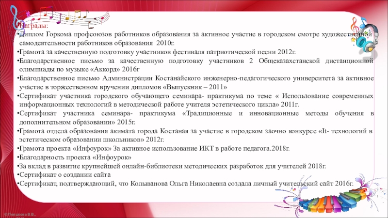 Курсы повышения квалификации при Омском Государственном педагогическом университете по теме: «Организация методической деятельности в образовательной среде» выдан сертификат серия ИРТ № 8031 с 5.02 по 12.02.2013г.