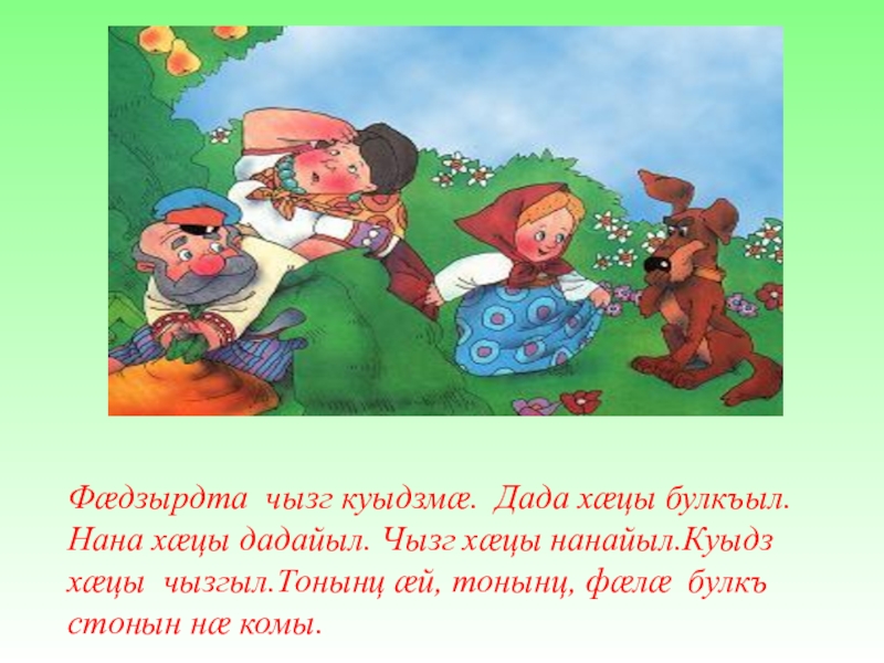 Слайд 6Фæдзырдта чызг куыдзмæ. Дада хæцы булкъыл. Нана хæцы дадайыл. Чызг хæцы