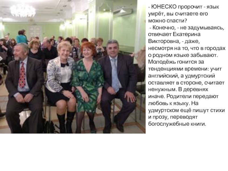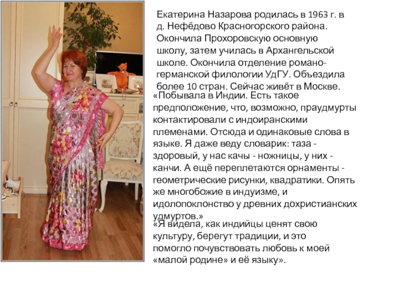«Побывала в Индии. Есть такое предположение, что, возможно, праудмурты контактировали с индоиранскими племенами. Отсюда и одинаковые слова в языке. Я даже веду словарик: таза - здоровый, у нас качы - ножницы, у них - канчи. А ещё переплетаются орнаменты - геометрические рисунки, квадратики. Опять же многобожие в индуизме, и идолопоклонство у древних дохристианских удмуртов.»