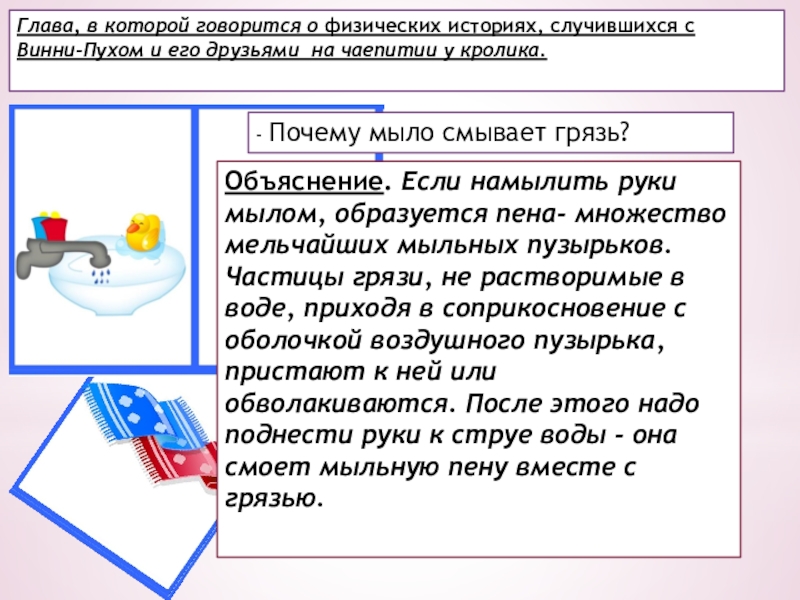 Объяснение. Если намылить руки мылом, образуется пена- множество мельчайших мыльных пузырьков. Частицы грязи, не растворимые в воде, приходя в соприкосновение с оболочкой воздушного пузырька, пристают к ней или обволакиваются. После этого надо поднести руки к струе воды - она смоет мыльную пену вместе с грязью.