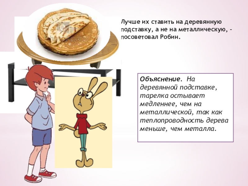 Объяснение. На деревянной подставке, тарелка остывает медленнее, чем на металлической, так как теплопроводность дерева меньше, чем металла.