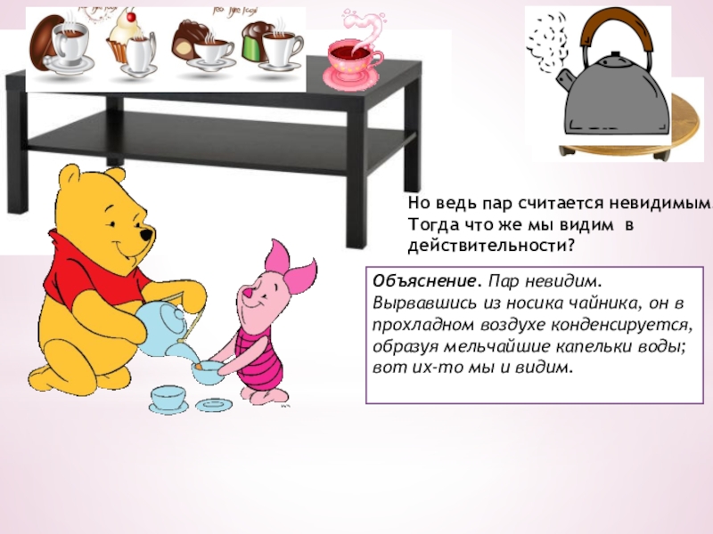 Объяснение. Пар невидим. Вырвавшись из носика чайника, он в прохладном воздухе конденсируется, образуя мельчайшие капельки воды; вот их-то мы и видим.