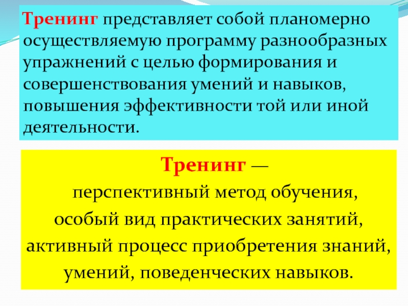 перспективный метод обучения, особый вид практических занятий, активный процесс приобретения знаний, умений, поведенческих навыков.