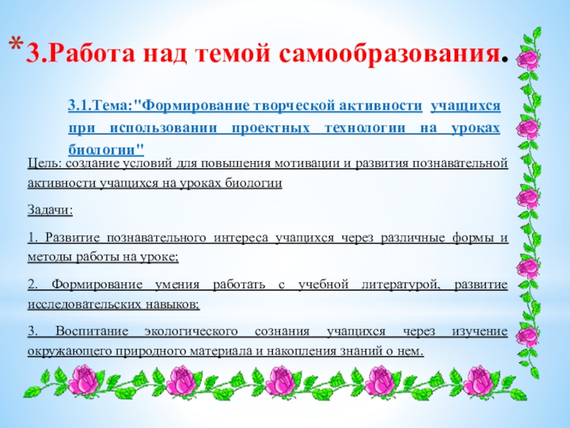 3. Воспитание экологического сознания учащихся через изучение окружающего природного материала и накопления знаний о нем.
