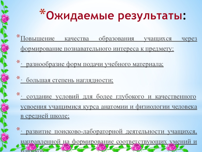 Цель: создание условий для повышения мотивации и развития познавательной активности учащихся на уроках биологии