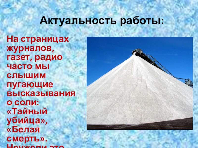 Актуальность работы:На страницах журналов, газет, радио часто мы слышим пугающие высказывания о соли: «Тайный убийца», «Белая смерть».