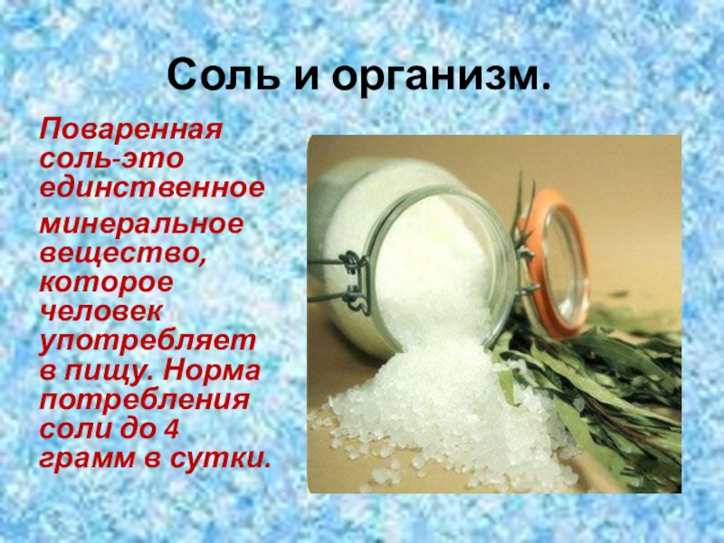 Соль и организм.Поваренная соль-это единственное минеральное вещество, которое человек употребляет в пищу. Норма потребления соли до 4