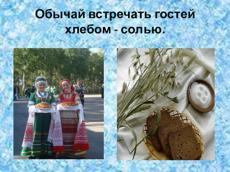 Слайд 17Обычай встречать гостей хлебом - солью.