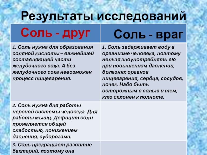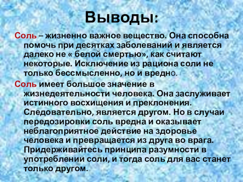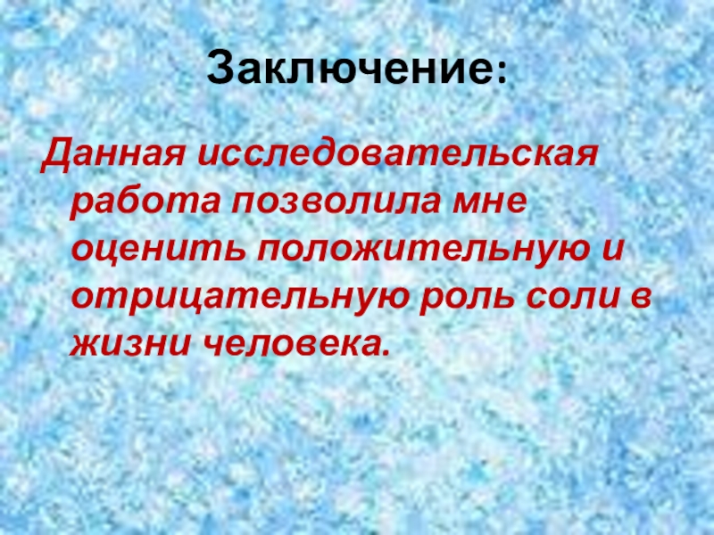 Заключение:Данная исследовательская работа позволила мне оценить положительную и отрицательную роль соли в жизни человека.