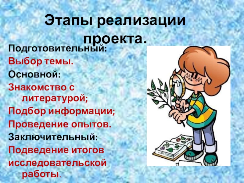 Этапы реализации проекта.Подготовительный:Выбор темы. Основной:Знакомство с литературой;Подбор информации;Проведение опытов.Заключительный:Подведение итогов исследовательской работы.