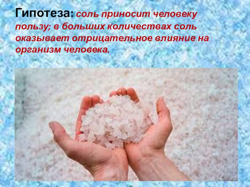 Слайд 5Гипотеза: соль приносит человеку пользу; в больших количествах соль оказывает отрицательное