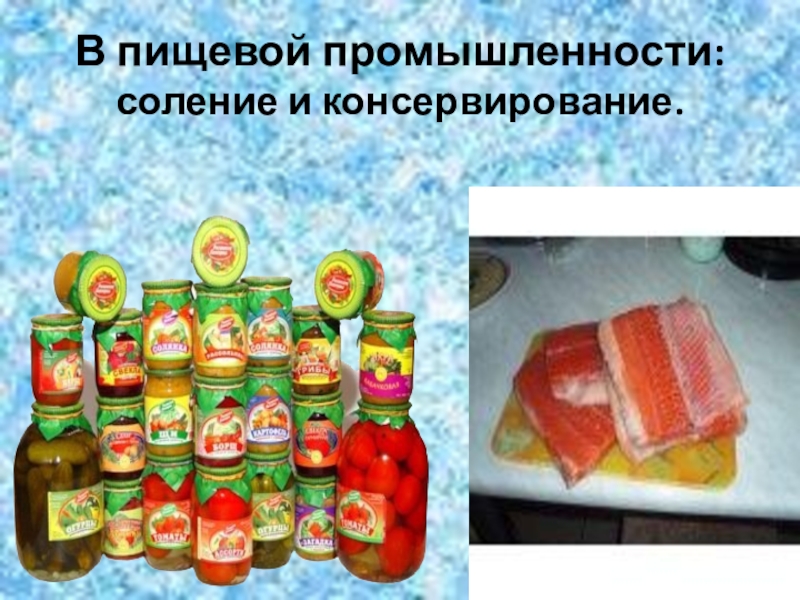 Слайд 16В пищевой промышленности: соление и консервирование.