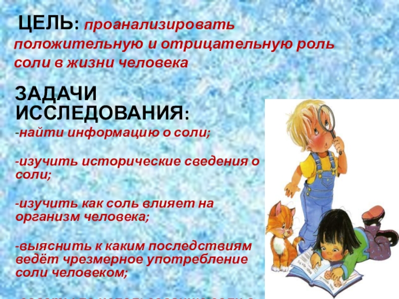 ЦЕЛЬ: проанализировать положительную и отрицательную роль соли в жизни человекаЗАДАЧИ ИССЛЕДОВАНИЯ:-найти информацию о соли;