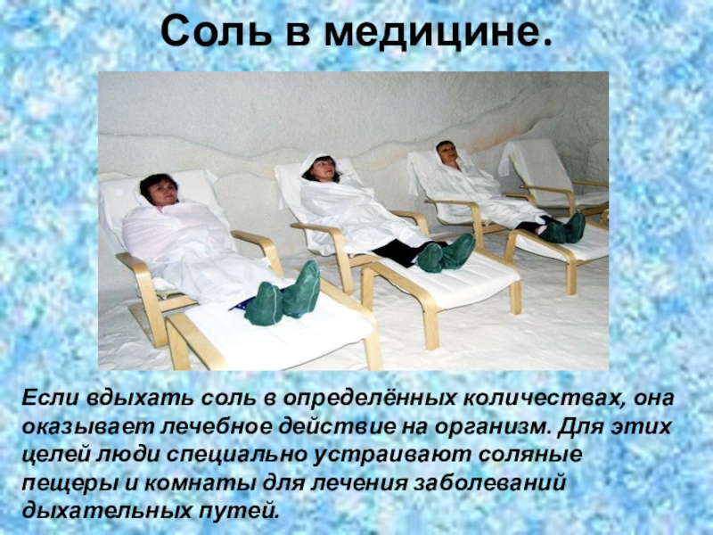 Соль в медицине.Если вдыхать соль в определённых количествах, она оказывает лечебное действие на организм. Для этих целей