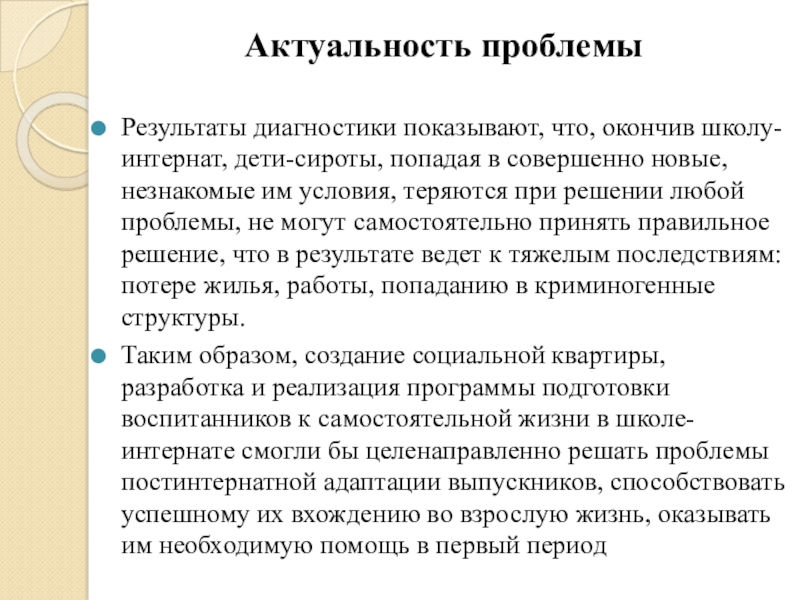 Актуальность проблемыРезультаты диагностики показывают, что, окончив школу-интернат, дети-сироты, попадая в совершенно новые, незнакомые им условия, теряются при