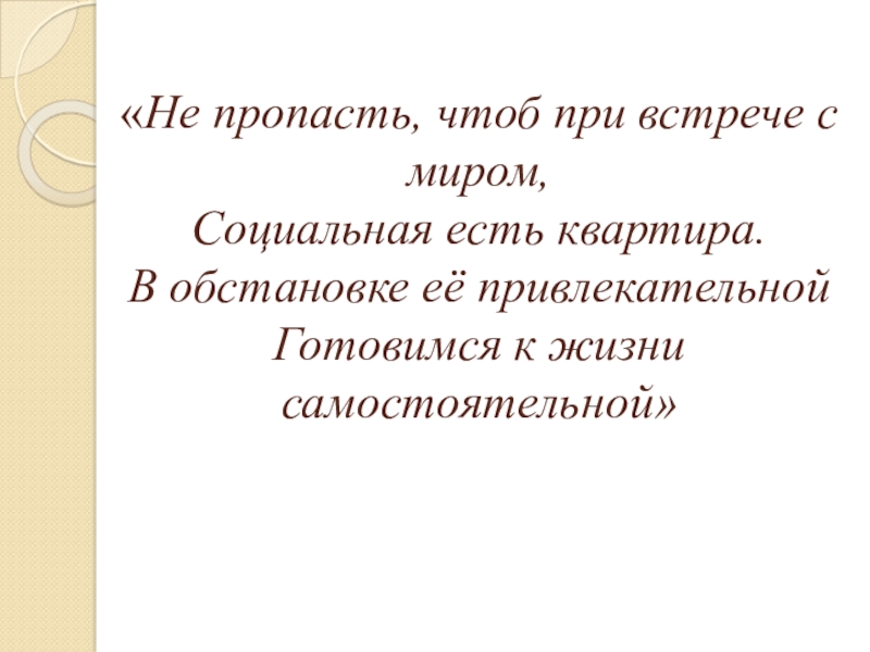 Слайд 4«Не пропасть, чтоб при встрече с миром, Социальная есть квартира. В обстановке