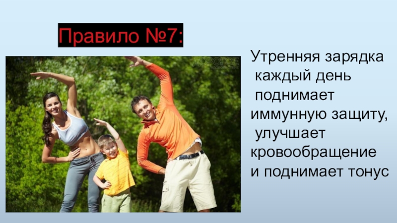 Правило №7:Утренняя зарядка каждый день поднимает иммунную защиту, улучшает кровообращение и поднимает тонус