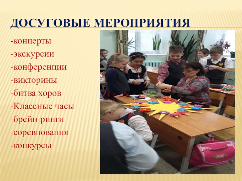 Досуговые мероприятия-концерты-экскурсии-конференции-викторины-битва хоров-Классные часы-брейн-ринги-соревнования-конкурсы