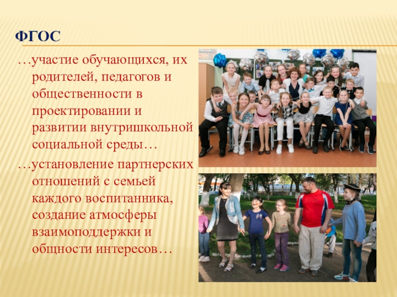 ФГОС …участие обучающихся, их родителей, педагогов и общественности в проектировании и развитии внутришкольной социальной среды……установление партнерских отношений с семьей каждого воспитанника, создание атмосферы взаимоподдержки и общности интересов…