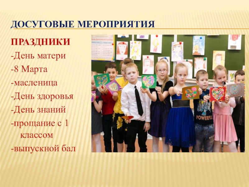 Досуговые мероприятияПРАЗДНИКИ-День матери-8 Марта-масленица-День здоровья-День знаний-прощание с 1 классом-выпускной бал