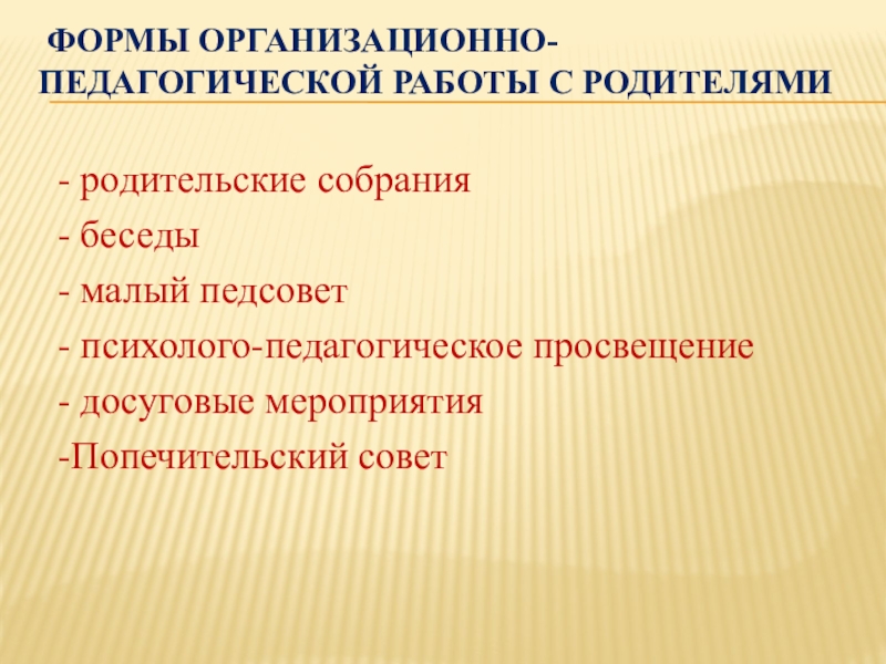 Формы организационно-педагогической работы с родителями - родительские собрания - беседы - малый педсовет - психолого-педагогическое просвещение