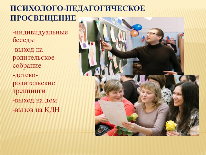 Психолого-педагогическое просвещение-индивидуальные беседы-выход на родительское собрание-детско-родительские треннинги-выход на дом-вызов на КДН
