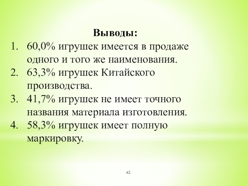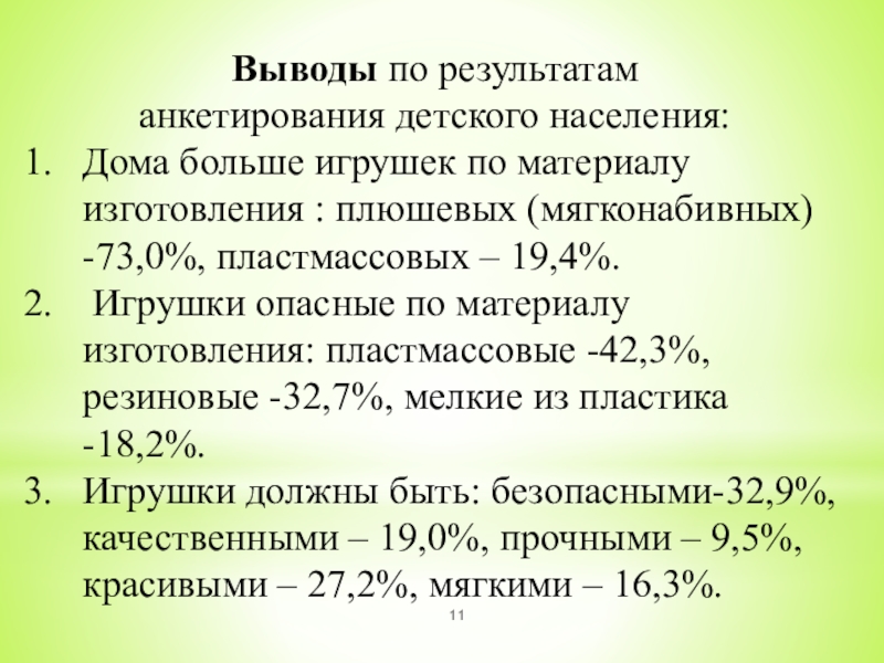 Игрушки опасные по материалу изготовления: пластмассовые -42,3%, резиновые -32,7%, мелкие из пластика -18,2%.