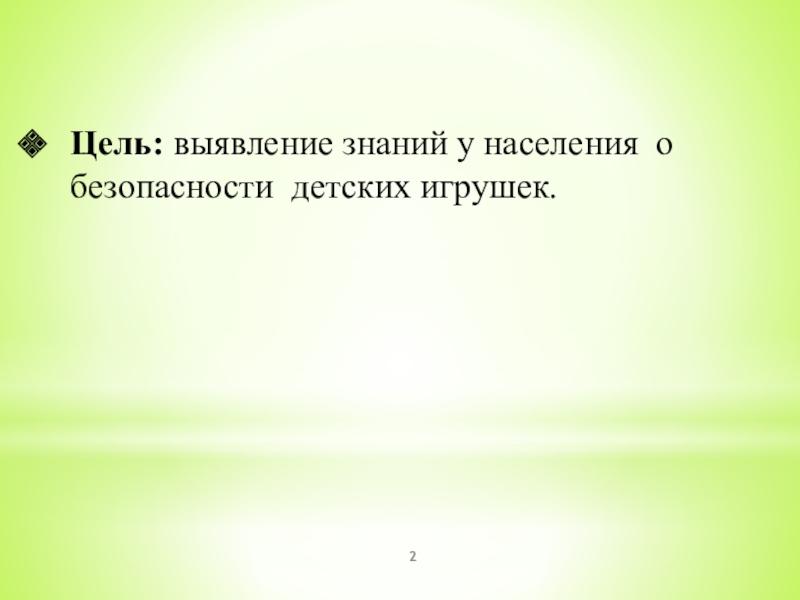 Слайд 2Цель: выявление знаний у населения о безопасности детских игрушек.