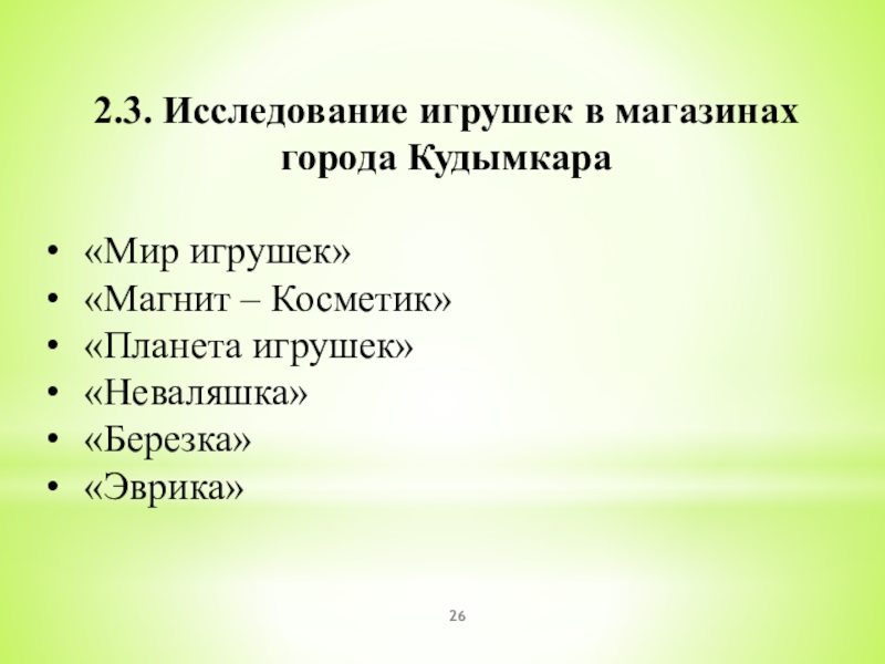 Слайд 262.3. Исследование игрушек в магазинах города Кудымкара
