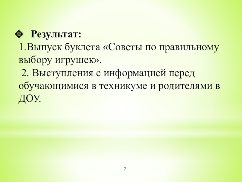 1.Выпуск буклета «Советы по правильному выбору игрушек».