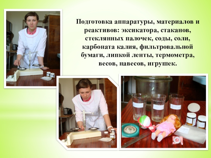 Слайд 18Подготовка аппаратуры, материалов и реактивов: эксикатора, стаканов, стеклянных палочек, соды, соли,