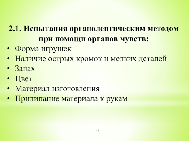 Слайд 152.1. Испытания органолептическим методом при помощи органов чувств: