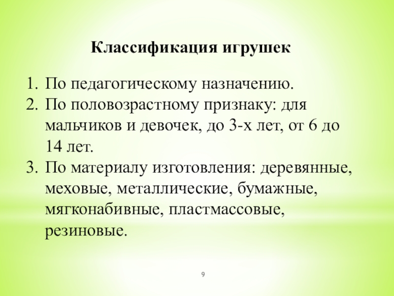 По материалу изготовления: деревянные, меховые, металлические, бумажные, мягконабивные, пластмассовые, резиновые.