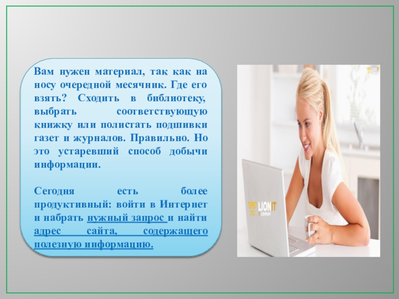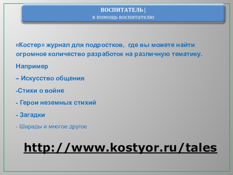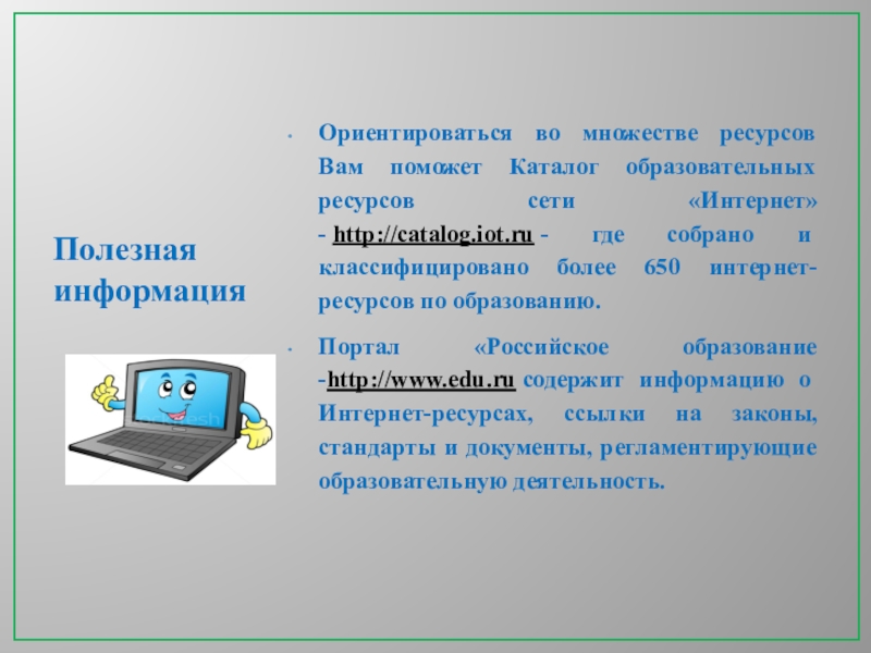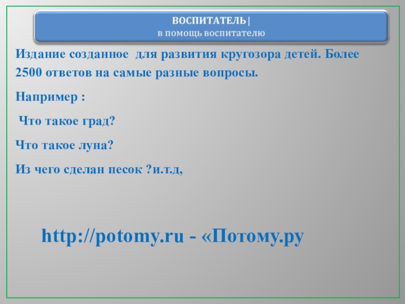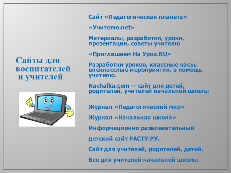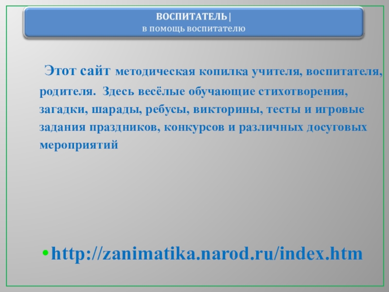 Это сайт презентаций, где можно хранить и обмениваться своими презентациями, докладами, проектами, шаблонами в формате PowerPoint с другими пользователями. Мы помогаем школьникам, студентам, учителям, преподавателям хранить и обмениваться учебными материалами.