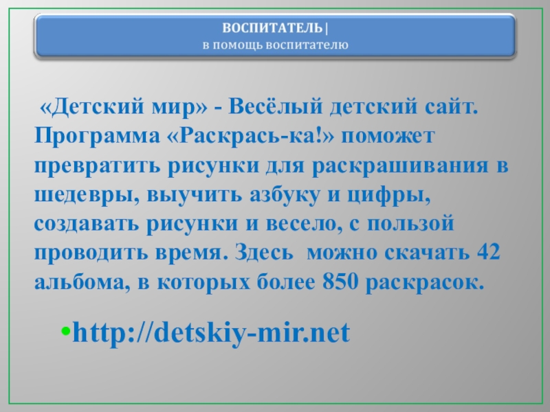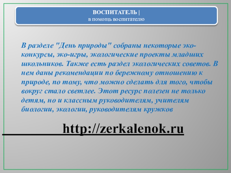 В разделе "День природы" собраны некоторые эко-конкурсы, эко-игры, экологические проекты младших школьников. Также есть раздел экологических советов. В нем даны рекомендации по бережному отношению к природе, по тому, что можно сделать для того, чтобы вокруг стало светлее. Этот ресурс полезен не только детям, но и классным руководителям, учителям биологии, экологии, руководителям кружков