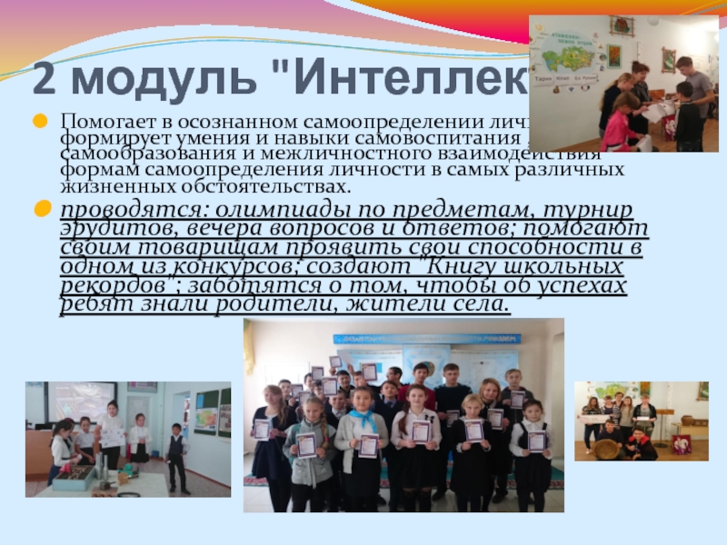 проводятся: олимпиады по предметам, турнир эрудитов, вечера вопросов и ответов; помогают своим товарищам проявить свои способности в одном из конкурсов; создают "Книгу школьных рекордов"; заботятся о том, чтобы об успехах ребят знали родители, жители села.