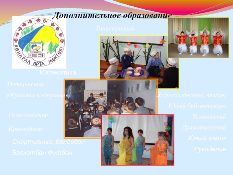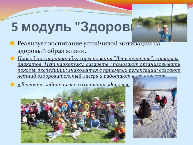 спартакиады, соревнования "День туриста", конкурсы плакатов "Нет наркотику, сигарете"; помогают организовывать походы, экспедиции; знакомятся с приемами релаксации; создают летний оздоровительный лагерь и работают в лесничестве