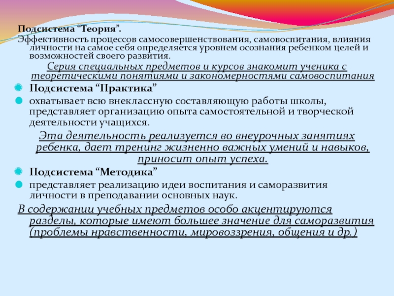 Серия специальных предметов и курсов знакомит ученика с теоретическими понятиями и закономерностями самовоспитания