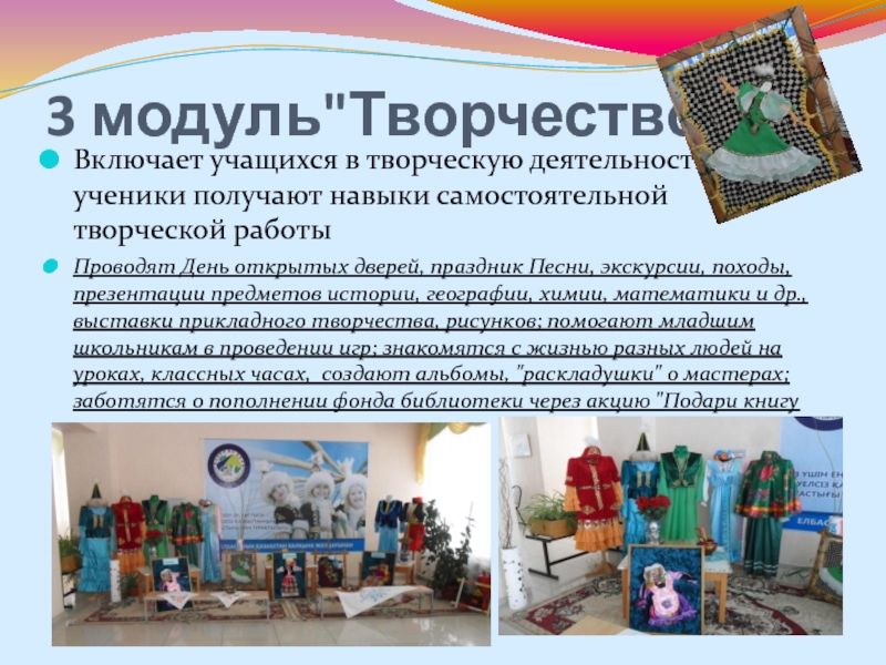 охватывает всю внеклассную составляющую работы школы, представляет организацию опыта самостоятельной и творческой деятельности учащихся.