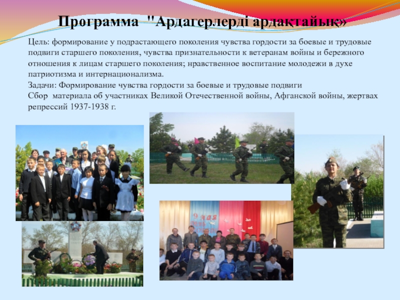 подвиги старшего поколения, чувства признательности к ветеранам войны и бережного отношения к лицам старшего поколения; нравственное воспитание молодежи в духе патриотизма и интернационализма.