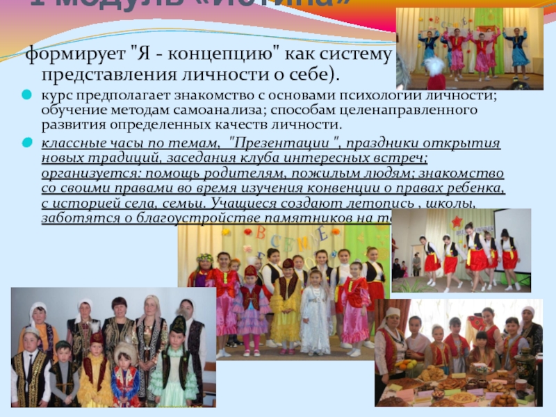 классные часы по темам, "Презентации ", праздники открытия новых традиций, заседания клуба интересных встреч; организуется: помощь родителям, пожилым людям; знакомство со своими правами во время изучения конвенции о правах ребенка, с историей села, семьи. Учащиеся создают летопись , школы, заботятся о благоустройстве памятников на территории округа