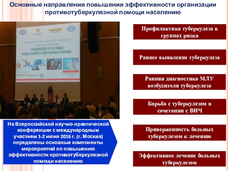 На Всероссийской научно-практической конференции с международным участием 1-2 июня 2016 г. (г. Москва) определены основные компоненты мероприятий по повышению эффективности противотуберкулезной помощи населению