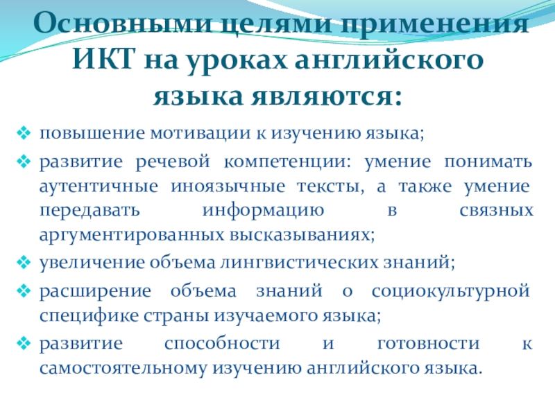 Использование ИКТ на уроке английского языка позволяет более полно реализовать целый комплекс методических, дидактических, педагогических и психологических принципов.