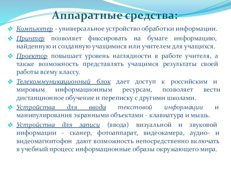 Устройства для записи (ввода) визуальной и звуковой информации - сканер, фотоаппарат, видеокамера, аудио- и видеомагнитофон дают возможность непосредственно включать в учебный процесс информационные образы окружающего мира.
