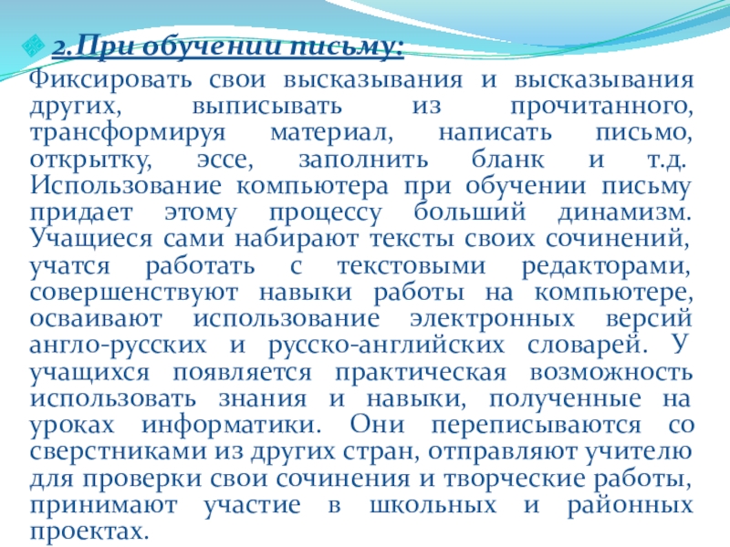 прочитанного, трансформируя материал, написать письмо, открытку, эссе, заполнить бланк и т.д. Использование компьютера при обучении письму придает этому процессу больший динамизм. Учащиеся сами набирают тексты своих сочинений, учатся работать с текстовыми редакторами, совершенствуют навыки работы на компьютере, осваивают использование электронных версий англо-русских и русско-английских словарей. У учащихся появляется практическая возможность использовать знания и навыки, полученные на уроках информатики. Они переписываются со сверстниками из других стран, отправляют учителю для проверки свои сочинения и творческие работы, принимают участие в школьных и районных проектах.