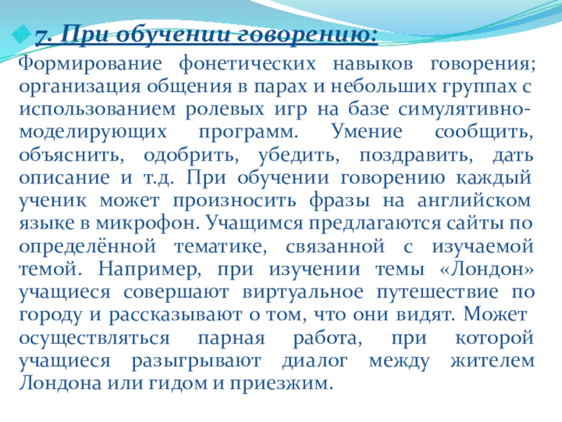 парах и небольших группах с использованием ролевых игр на базе симулятивно-моделирующих программ. Умение сообщить, объяснить, одобрить, убедить, поздравить, дать описание и т.д. При обучении говорению каждый ученик может произносить фразы на английском языке в микрофон. Учащимся предлагаются сайты по определённой тематике, связанной с изучаемой темой. Например, при изучении темы «Лондон» учащиеся совершают виртуальное путешествие по городу и рассказывают о том, что они видят. Может осуществляться парная работа, при которой учащиеся разыгрывают диалог между жителем Лондона или гидом и приезжим.